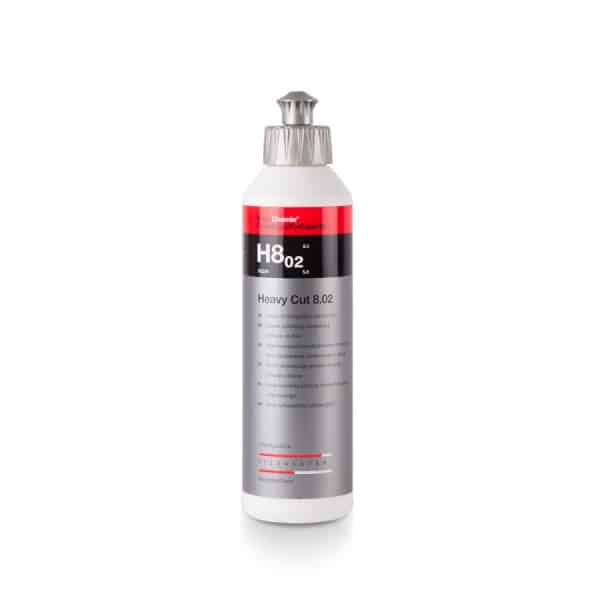 Иновативната едра полираща паста Koch Chemie Heavy Cut H8.02 , oдобренa от Daimler AG, е предназначена за бърза обработка на силно износен лак, премахване на дълбоки драскотини и ожулвания. Създадена e по най-иновативни технологии и се използва широко в съвременните центрове за детайлинг и боядисване. Благодарение на хомогенният си абразивен състав, пастата Koch Heavy Cut 8.02 постига изключително високо ниво на рязане с отлично ниво на гланц. Подходяща е за дълготрайно полиране на всички видове лакове (както меки, така и устойчиви на надраскване). Отсъствието на прах и залепване се осигурява от най-добрите емулгатори и масла, които съставят тази паста.